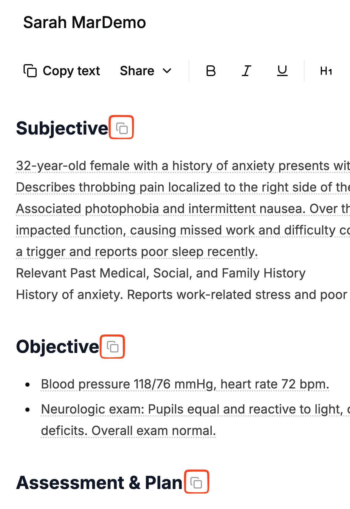 - Click a section header (for example, Assessment & Plan) and select the copy block icon to grab that entire section