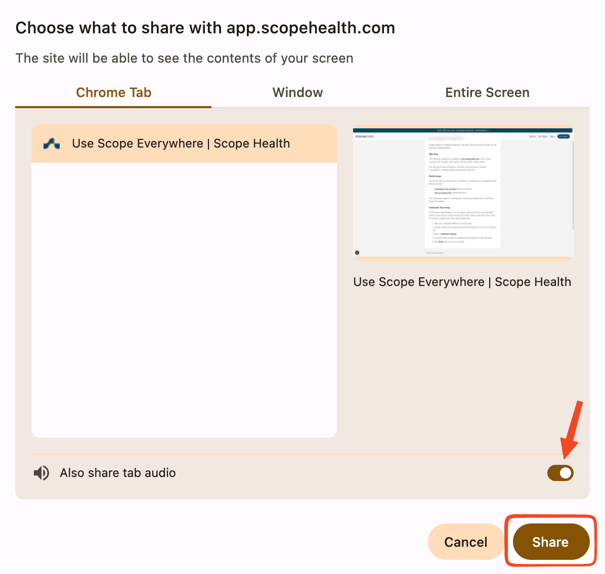- Choose the tab running your telehealth call and enable "Share tab audio"
