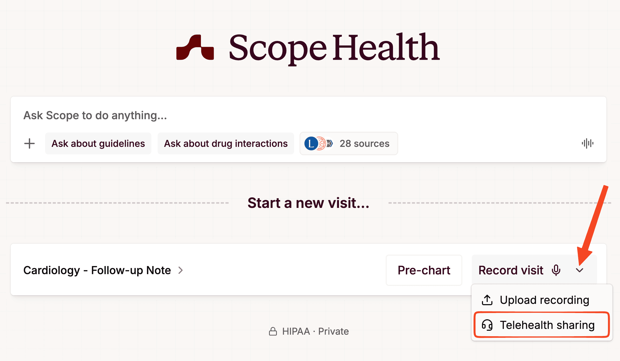 On Chrome or Edge desktop, you can capture audio directly from your telehealth platform using browser screen sharing. This allows Scope to hear both sides of the conversation clearly, even when using headphones.
